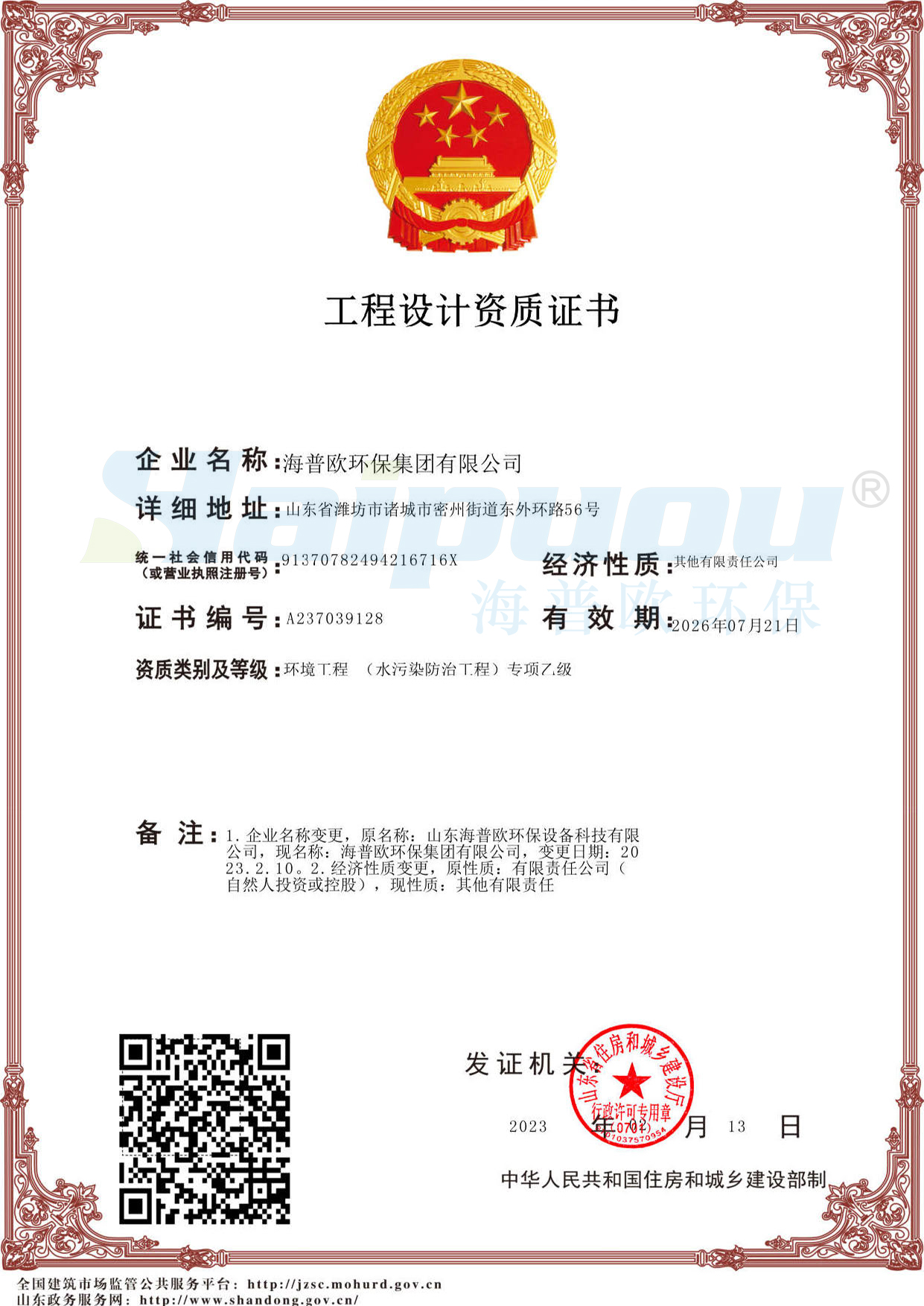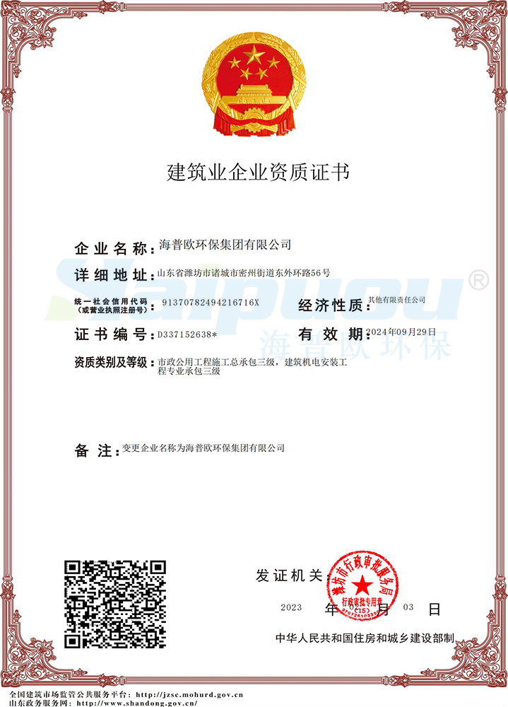 擁有環(huán)保工程專(zhuān)業(yè)承包資質(zhì) 叁級(jí)、安全生產(chǎn)許可證